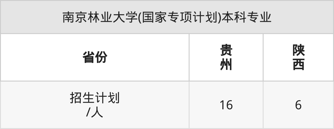 南京林业大学(国家专项计划)面向贵州(16人)、陕西(6人)开展本科招生。招生批次为本科一批。