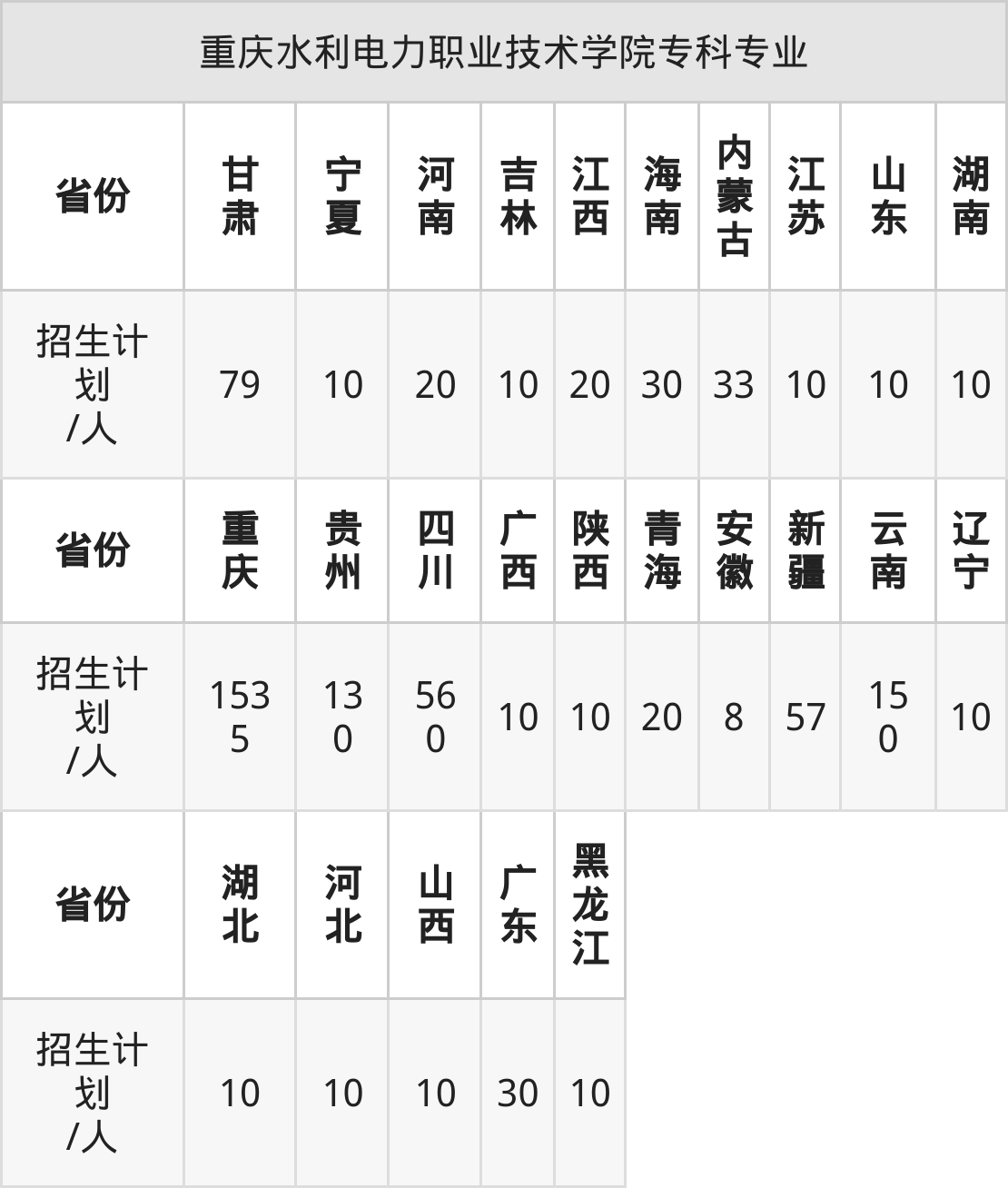 重庆水利电力职业技术学院面向内蒙古(33人)、甘肃(79人)、山东(10人)、湖北(10人)、湖南(10人)、河北(10人)、黑龙江(10人)等25个地区开展专科招生。其中山东招生批次为二段,其余省份为专科批。