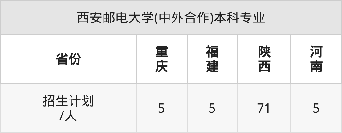西安邮电大学(中外合作)面向陕西(71人)、河南(5人)、重庆(5人)、福建(5人)开展本科招生。招生批次为本科一批。