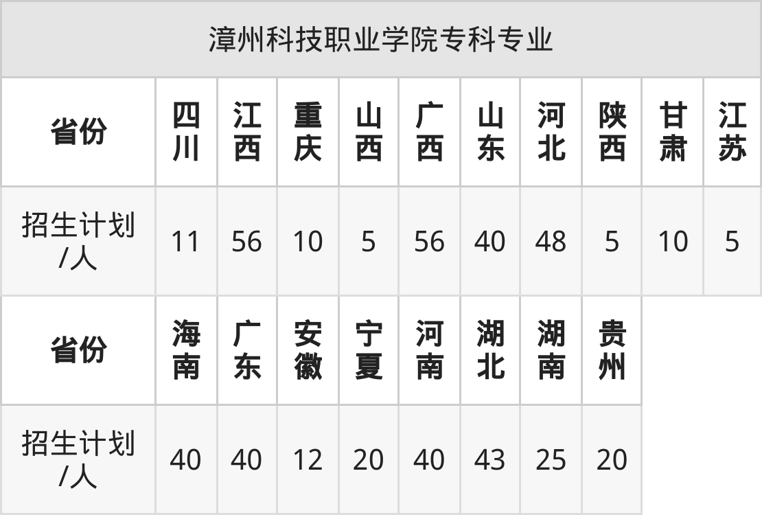 漳州科技职业学院面向贵州(20人)、广东(40人)、陕西(5人)、宁夏(20人)、湖南(25人)、海南(40人)、河北(48人)等18个地区开展专科招生。其中山东招生批次为二段,其余省份为专科批。