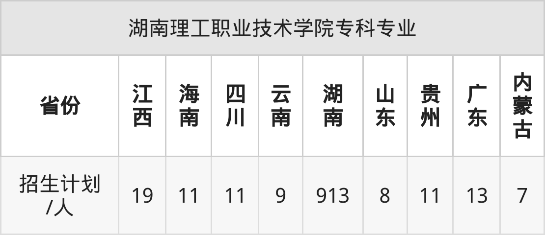 湖南理工职业技术学院面向广东(13人)、四川(11人)、山东(8人)、湖南(913人)、江西(19人)、海南(11人)、贵州(11人)等9个地区开展专科招生。其中山东招生批次为二段,其余省份为专科批。