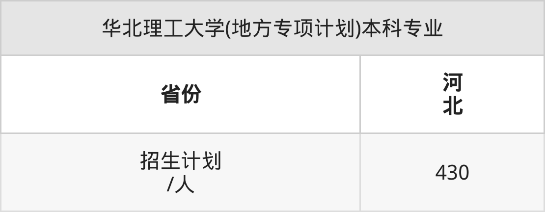 华北理工大学(地方专项计划)面向河北(430人)开展本科招生。招生批次为本科批。