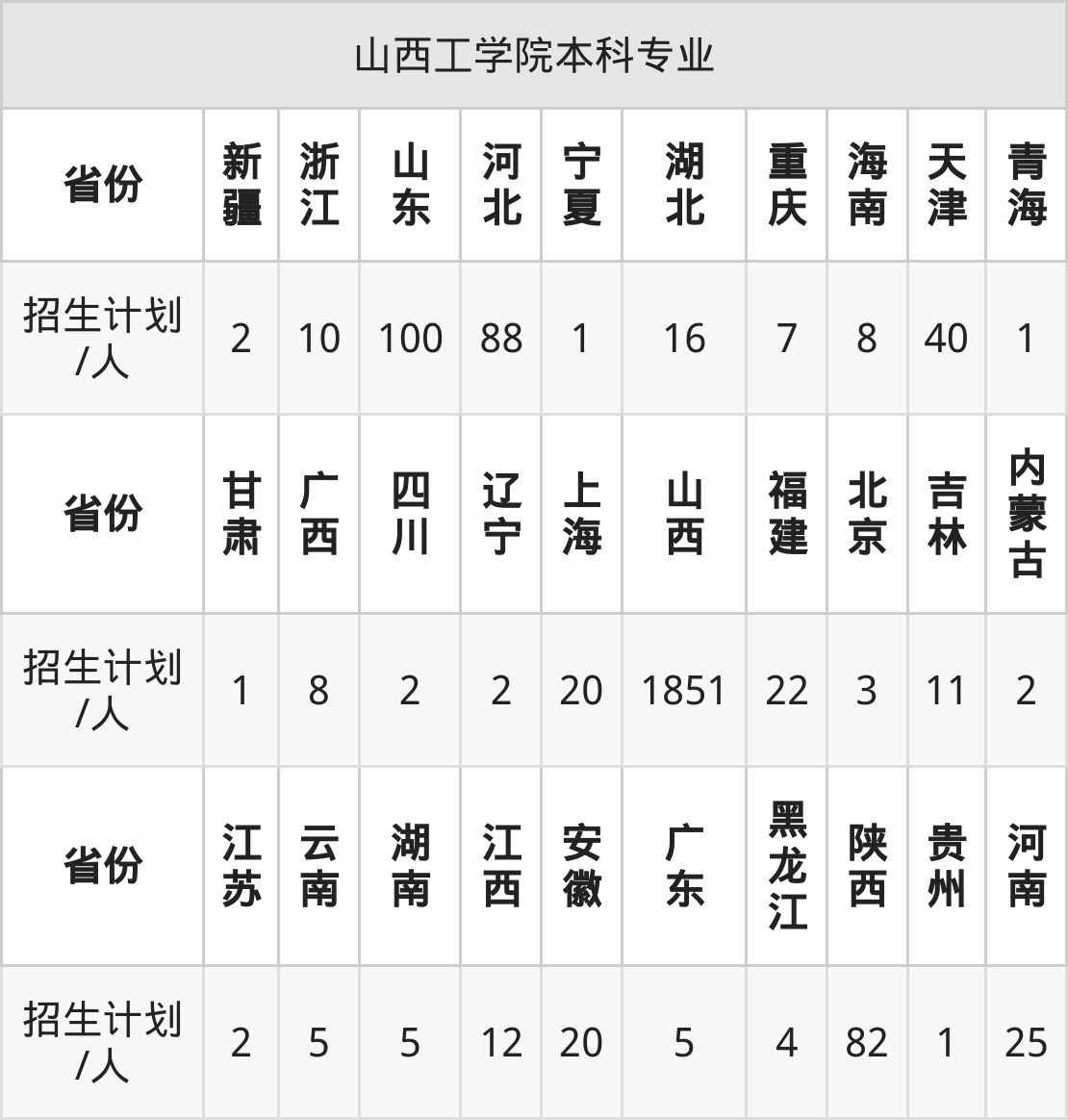 山西工学院面向云南(5人)、重庆(7人)、上海(20人)、河南(25人)、山东(100人)、湖北(16人)、天津(40人)等30个地区开展本科招生。其中四川、陕西、河南、内蒙古、新疆招生批次为本科二批,其余省份为本科批。