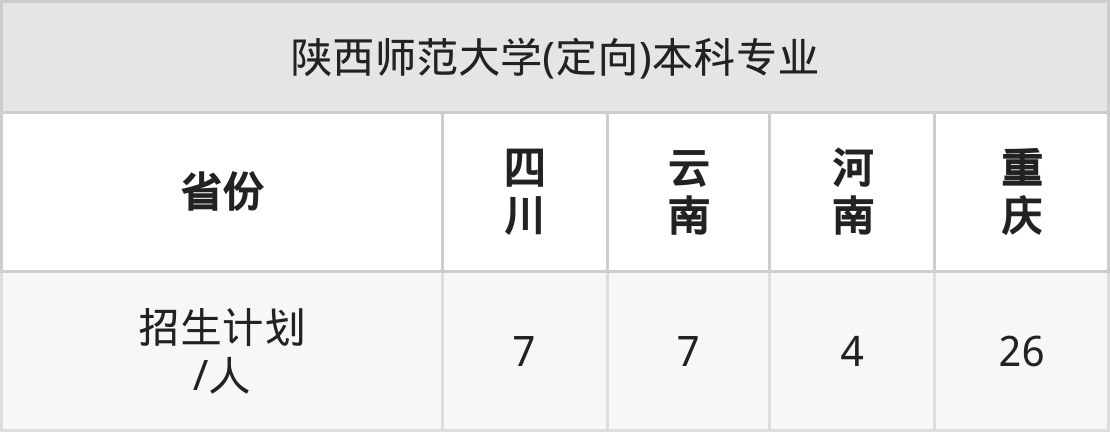 陕西师范大学(定向)面向重庆(26人)、四川(7人)、云南(7人)、河南(4人)开展本科招生。其中云南招生批次为一本,其余省份为本科一批。