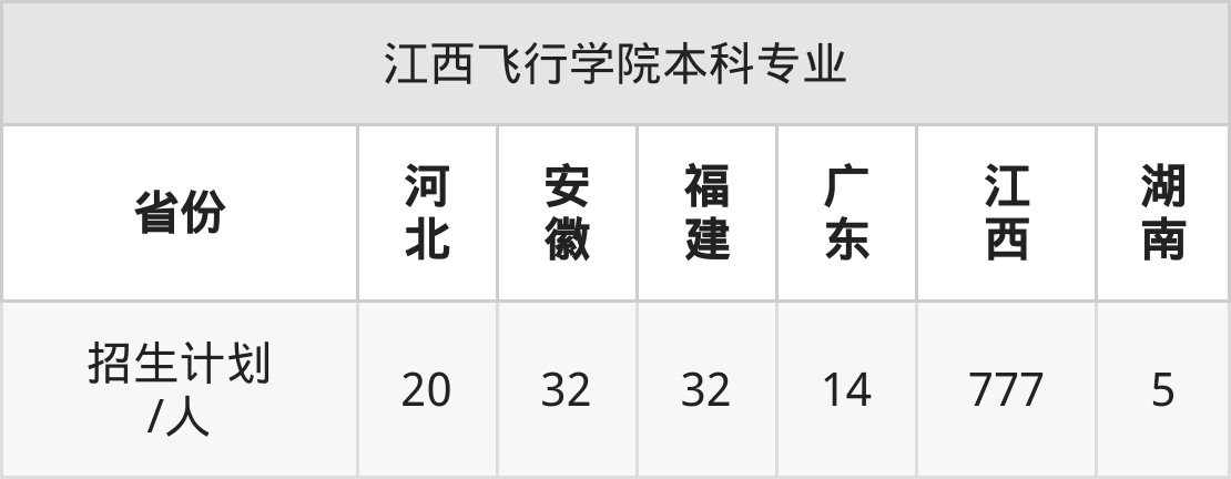 江西飞行学院面向江西(777人)、湖南(5人)、河北(20人)、安徽(32人)、福建(32人)、广东(14人)开展本科招生。招生批次为本科批。