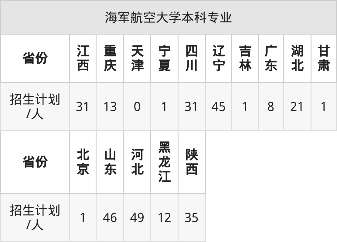 海军航空大学面向广东(8人)、四川(31人)、黑龙江(12人)、陕西(35人)、山东(46人)、吉林(1人)、河北(49人)等15个地区开展本科招生。其中吉林、天津、甘肃、重庆、河北、北京招生批次为本科提前批A,其余省份为本科提前批。