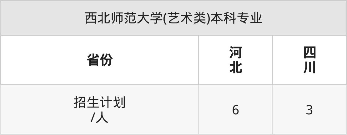 西北师范大学(艺术类)面向河北(6人)、四川(3人)开展本科招生。招生批次为本科一批。