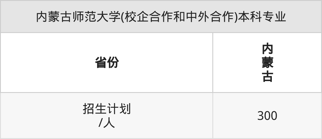 内蒙古师范大学(校企合作和中外合作)面向内蒙古(300人)开展本科招生。招生批次为本科二批。