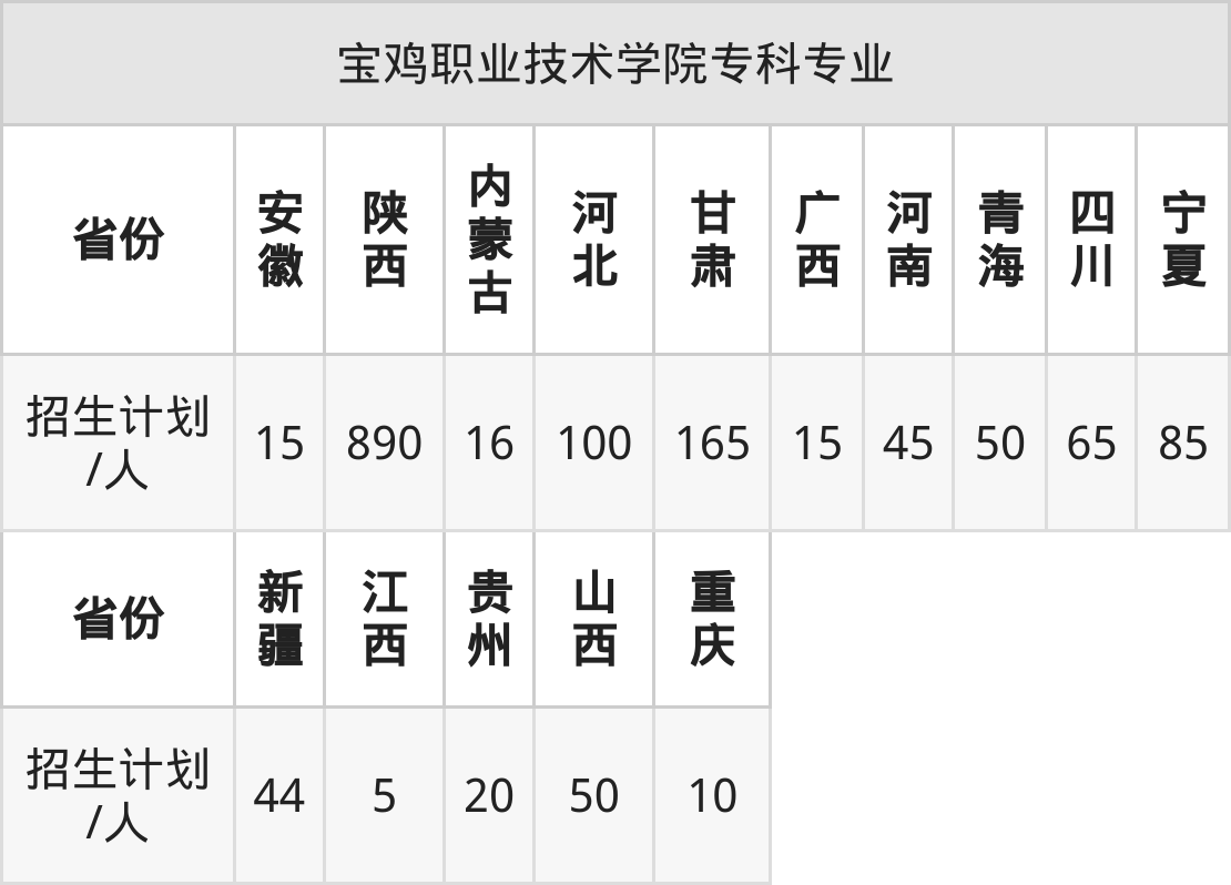 宝鸡职业技术学院面向贵州(20人)、新疆(44人)、广西(15人)、河南(45人)、江西(5人)、安徽(15人)、青海(50人)等15个地区开展专科招生。招生批次为专科批。