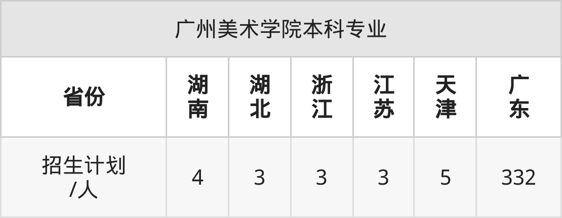 广州美术学院面向湖北(3人)、湖南(4人)、天津(5人)、浙江(3人)、广东(332人)、江苏(3人)开展本科招生。其中天津招生批次为本科批A段,其余省份为本科批。