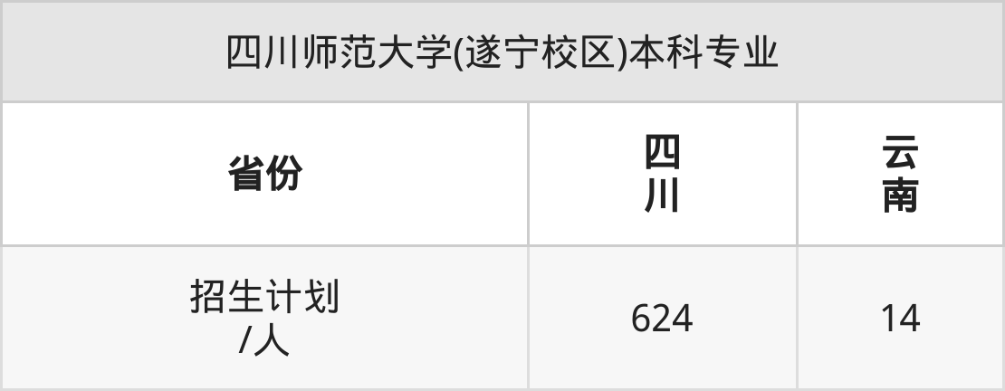 四川师范大学(遂宁校区)面向四川(624人)、云南(14人)开展本科招生。招生批次为一本。