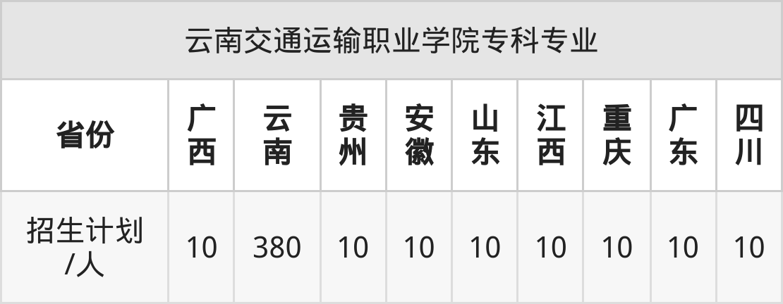 云南交通运输职业学院面向广西(10人)、江西(10人)、重庆(10人)、贵州(10人)、广东(10人)、四川(10人)、云南(380人)等9个地区开展专科招生。其中山东招生批次为二段,其余省份为专科批。