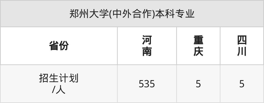郑州大学(中外合作)面向重庆(5人)、四川(5人)、河南(535人)开展本科招生。其中重庆招生批次为本科批,其余省份为本科一批。