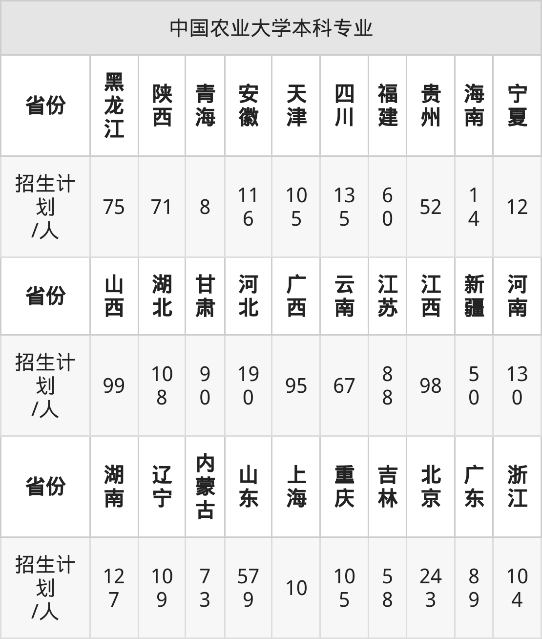 中国农业大学面向贵州(52人)、北京(243人)、湖南(127人)、天津(105人)、广东(89人)、内蒙古(73人)、云南(67人)等30个地区开展本科招生。其中山东招生批次为一段,河南、新疆、内蒙古、四川、陕西招生批次为本科一批,其余省份为本科批。