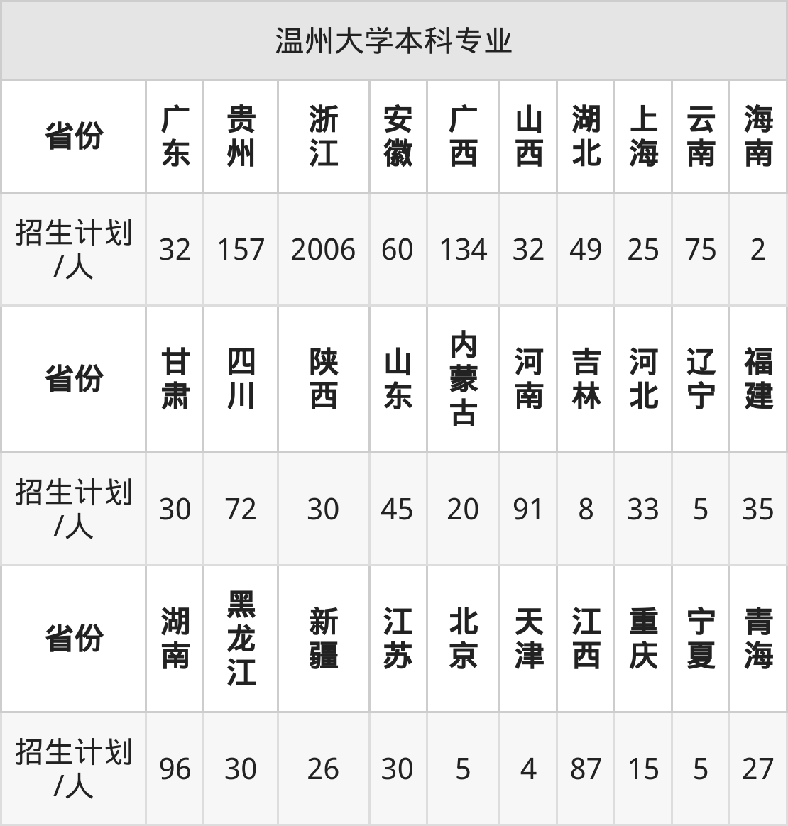 温州大学面向甘肃(30人)、内蒙古(20人)、湖南(96人)、山东(45人)、海南(2人)、重庆(15人)、广东(32人)等30个地区开展本科招生。其中山东招生批次为一段,内蒙古、河南招生批次为本科一批,四川、新疆、陕西招生批次为本科二批,其余省份为本科批。