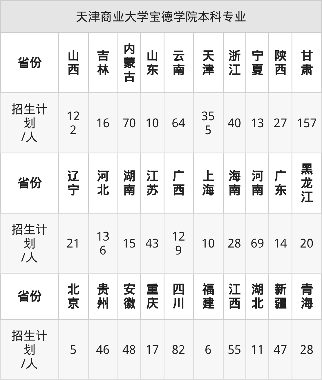 天津商业大学宝德学院面向青海(28人)、内蒙古(70人)、黑龙江(20人)、四川(82人)、上海(10人)、湖南(15人)、江西(55人)等30个地区开展本科招生。其中宁夏招生批次为第二批本科,河南、陕西、内蒙古、四川、新疆招生批次为本科二批,其余省份为本科批。