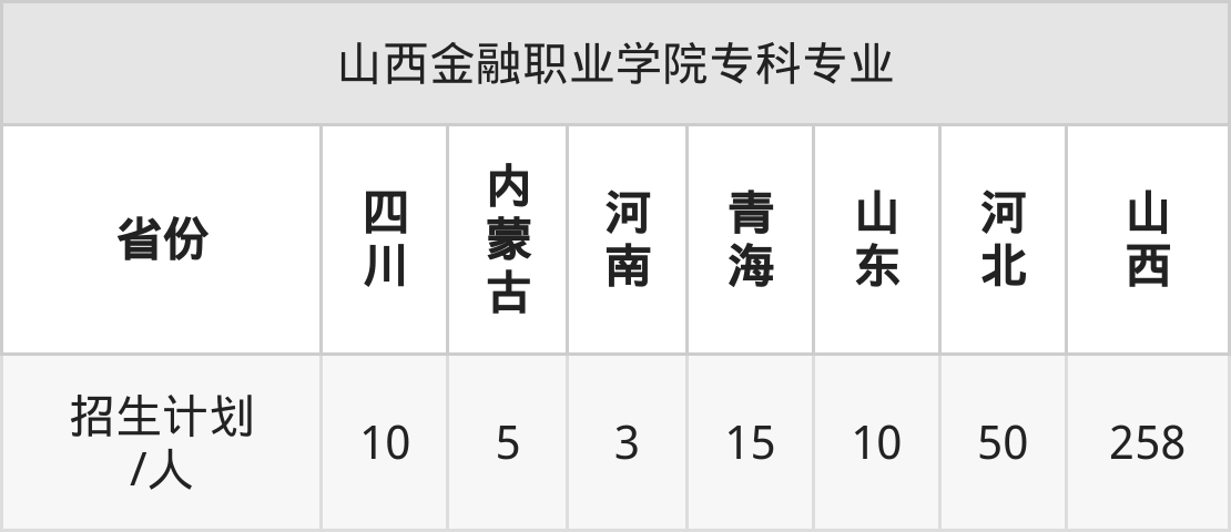 山西金融职业学院面向青海(15人)、山东(10人)、河北(50人)、山西(258人)、四川(10人)、内蒙古(5人)、河南(3人)等7个地区开展专科招生。其中山东招生批次为二段,其余省份为专科批。
