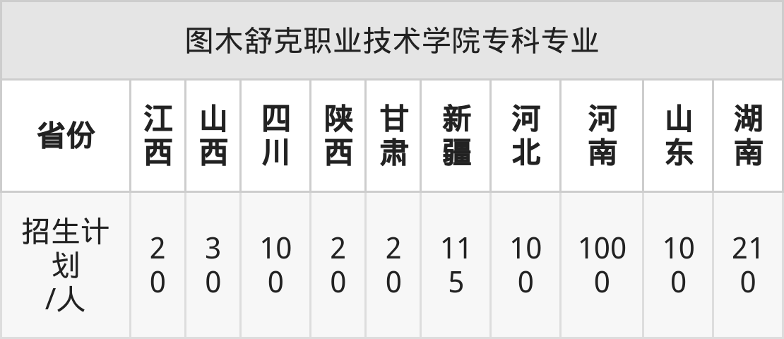 图木舒克职业技术学院面向甘肃(20人)、新疆(115人)、山东(100人)、湖南(210人)、陕西(20人)、河南(1000人)、江西(20人)等10个地区开展专科招生。其中山东招生批次为二段,其余省份为专科批。