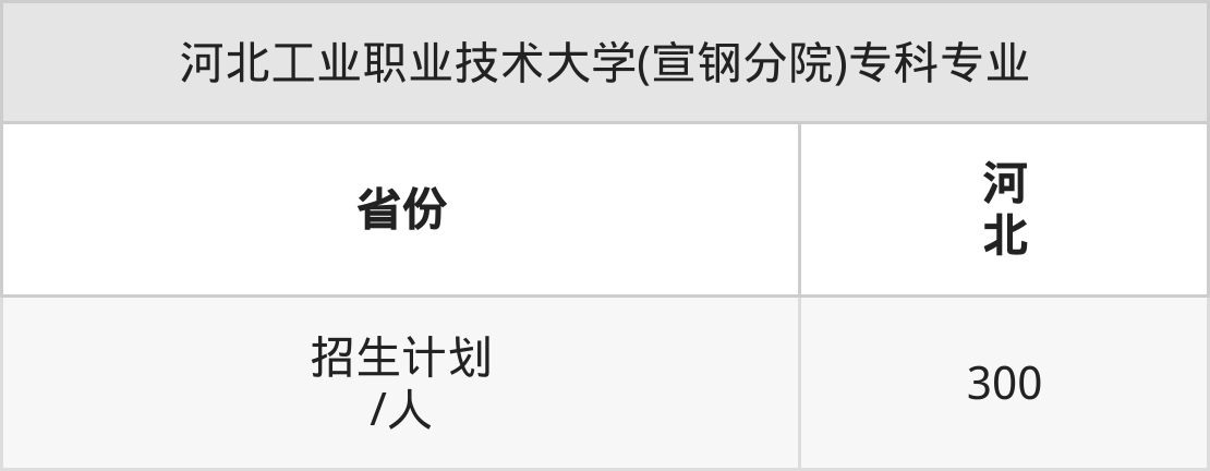 河北工业职业技术大学(宣钢分院)面向河北(300人)开展专科招生。招生批次为专科批。