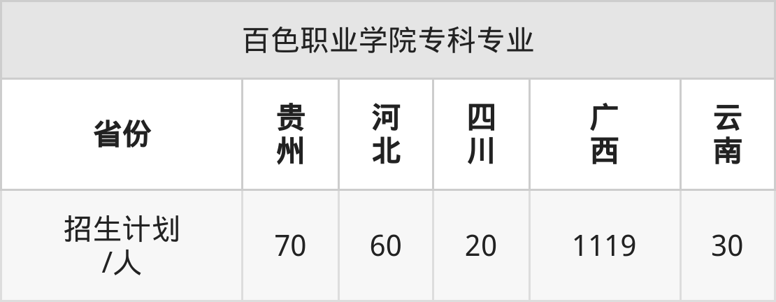 百色职业学院面向广西(1119人)、云南(30人)、贵州(70人)、河北(60人)、四川(20人)开展专科招生。招生批次为专科批。
