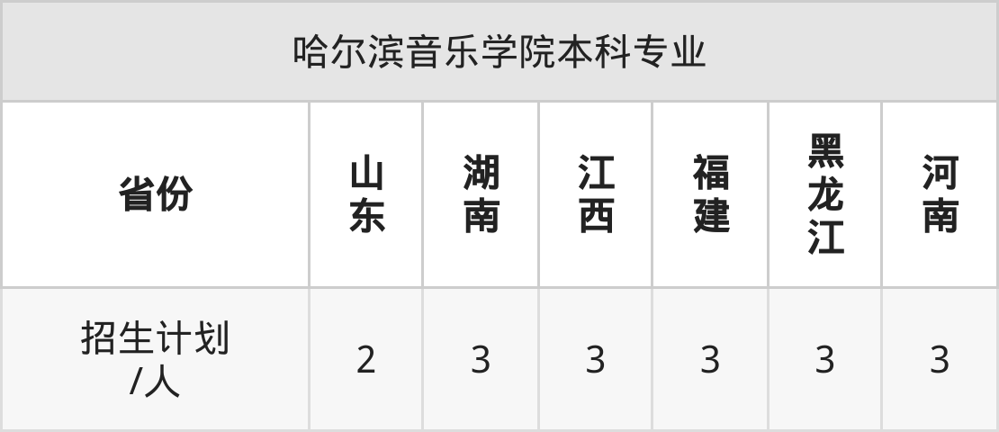 哈尔滨音乐学院面向山东(2人)、湖南(3人)、江西(3人)、福建(3人)、黑龙江(3人)、河南(3人)开展本科招生。其中山东招生批次为一段,其余省份为本科批。