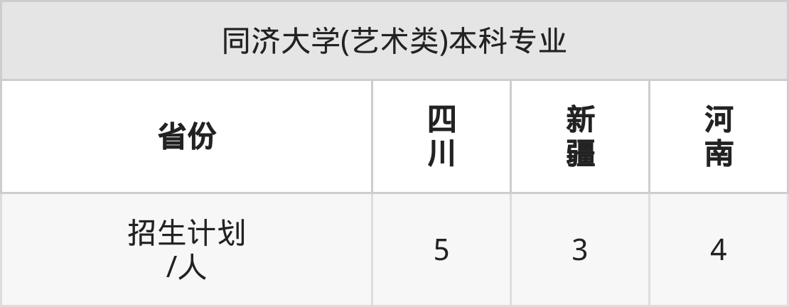 同济大学(艺术类)面向四川(5人)、新疆(3人)、河南(4人)开展本科招生。招生批次为本科一批。