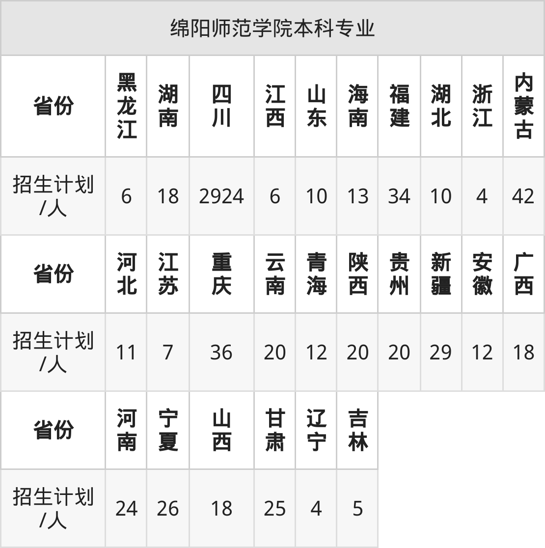 绵阳师范学院面向吉林(5人)、山东(10人)、河北(11人)、重庆(36人)、福建(34人)、黑龙江(6人)、云南(20人)等26个地区开展本科招生。其中山西招生批次为第二批本科A类,四川、内蒙古、河南、陕西、新疆招生批次为本科二批,其余省份为本科批。