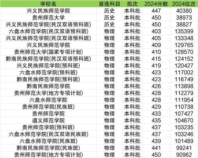 2024年贵州省400-450分的师范类大学中,历史类能报考的有2所,物理类能报考的学校有6所,全部都是本科批录取。