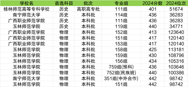 广西2024年在400-450分的师范类大学中,历史类能报考的大学有4所,物理类有3所,历史类物理类都可以上的是玉林师范学院、南宁师范大学等,其中物理类均为本科大学、历史类既有本科批录取也有专科批录取。具体院校专业组名单如下表所示: