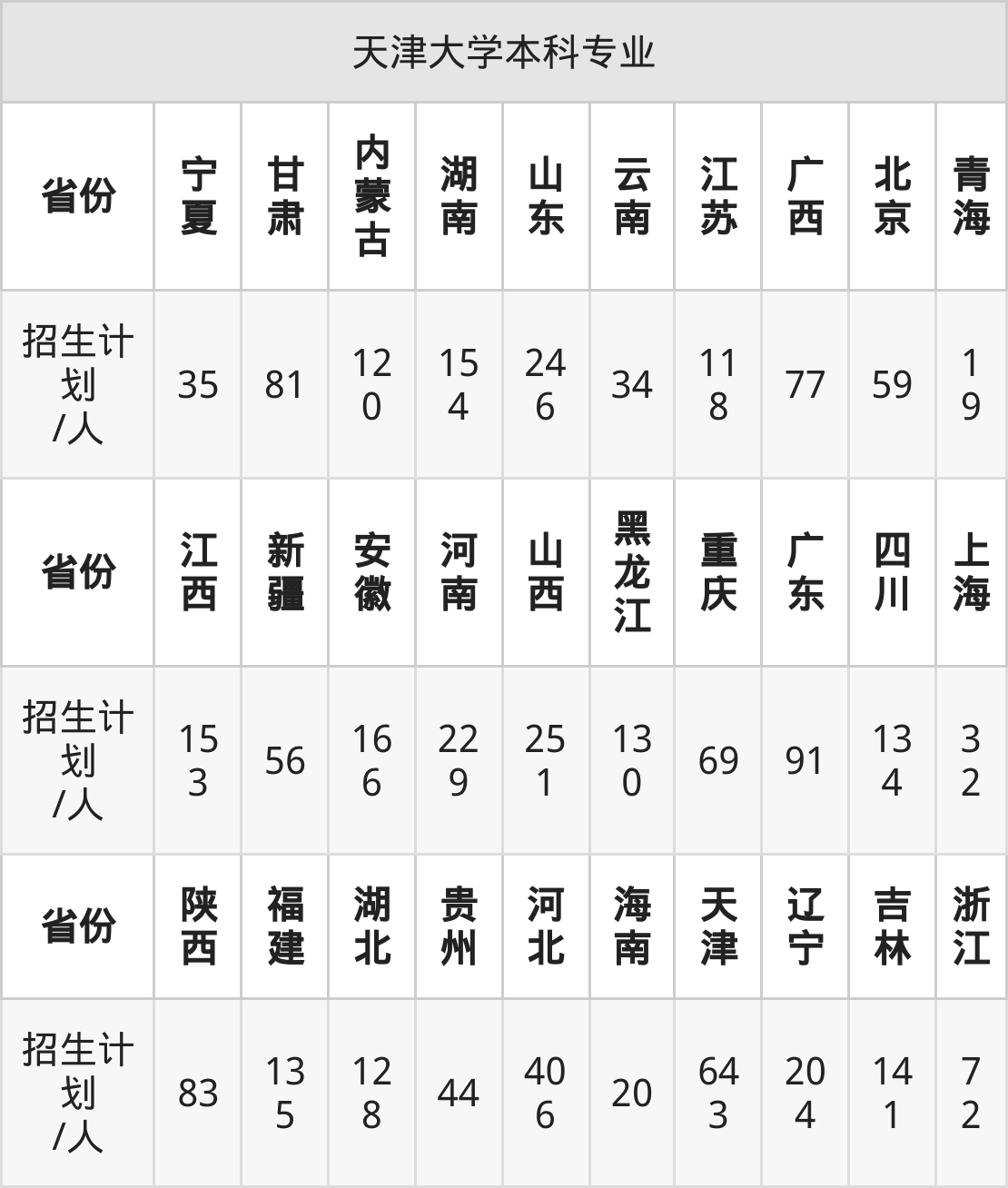 天津大学面向四川(134人)、上海(32人)、海南(20人)、吉林(141人)、广东(91人)、江苏(118人)、河南(229人)等30个地区开展本科招生。其中河北招生批次为本科提前批C,陕西、河南、内蒙古、新疆、四川招生批次为本科一批,其余省份为本科批。