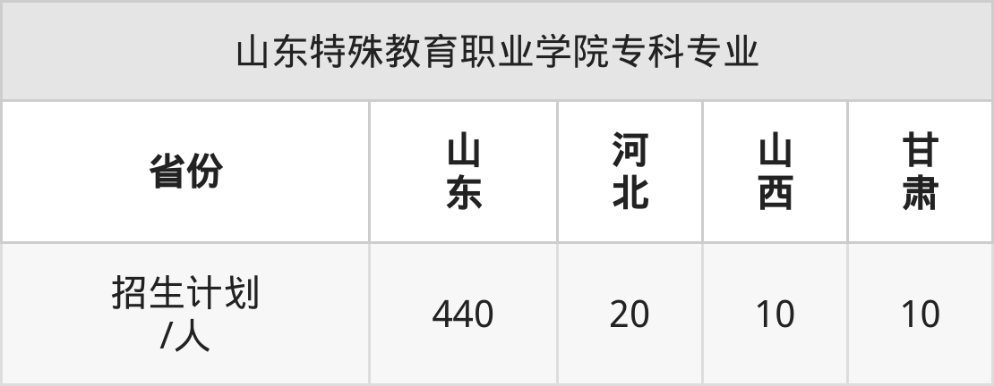 山东特殊教育职业学院面向河北(20人)、山西(10人)、甘肃(10人)、山东(440人)开展专科招生。其中山东招生批次为二段,其余省份为专科批。