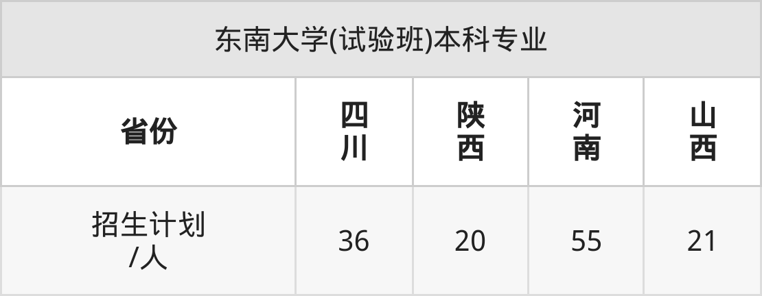 东南大学(试验班)面向四川(36人)、陕西(20人)、河南(55人)、山西(21人)开展本科招生。其中山西招生批次为第一批本科A类,其余省份为本科一批。