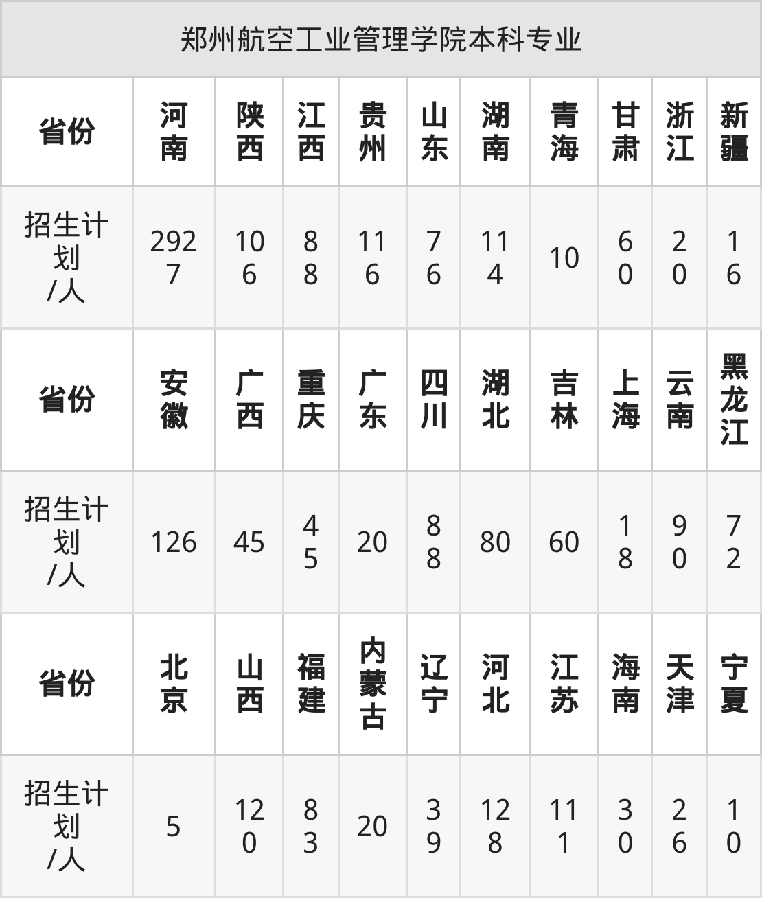 郑州航空工业管理学院面向云南(90人)、海南(30人)、河北(128人)、黑龙江(72人)、宁夏(10人)、上海(18人)、江西(88人)等30个地区开展本科招生。其中云南招生批次为二本,新疆、内蒙古、陕西、四川招生批次为本科二批,其余省份为本科批。