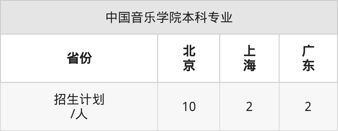 中国音乐学院面向北京(10人)、上海(2人)、广东(2人)开展本科招生。招生批次为本科批。