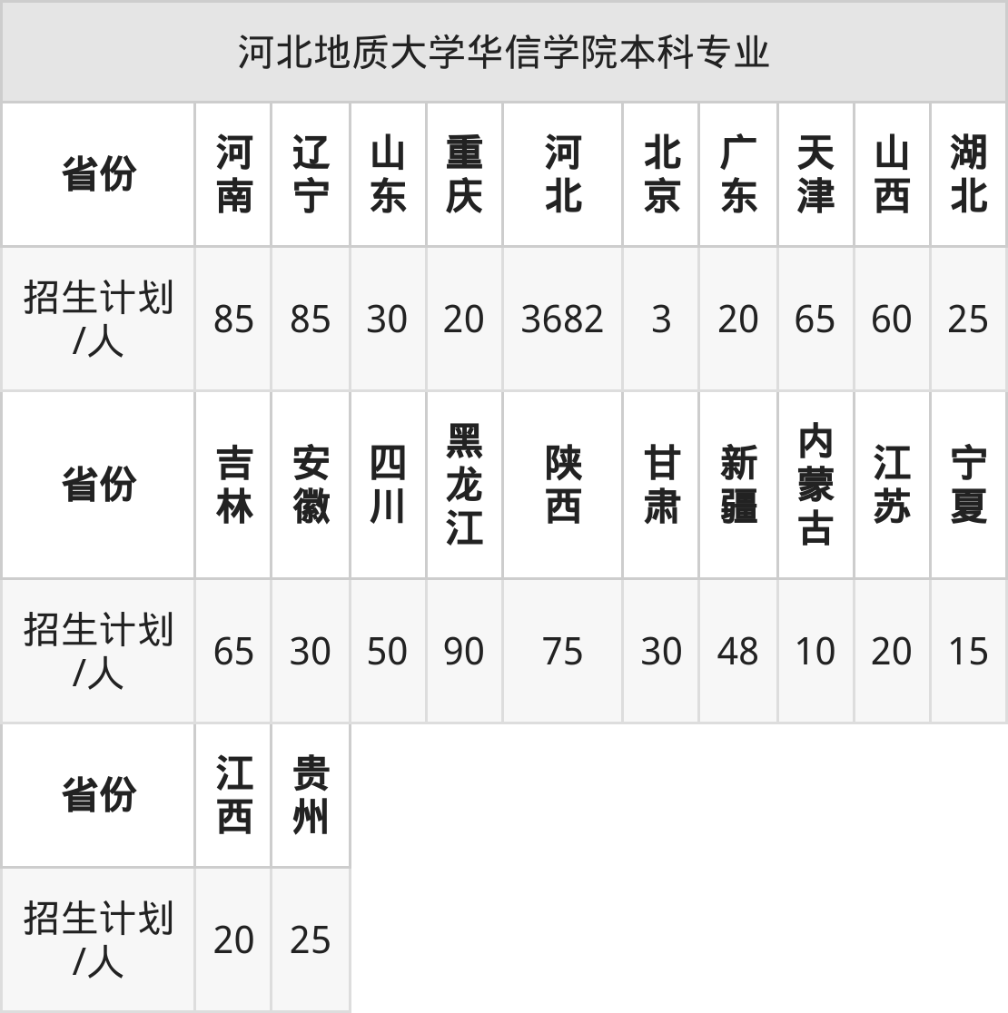 河北地质大学华信学院面向黑龙江(90人)、北京(3人)、辽宁(85人)、吉林(65人)、重庆(20人)、新疆(48人)、山东(30人)等22个地区开展本科招生。其中宁夏招生批次为第二批本科,河南、陕西、内蒙古、新疆、四川招生批次为本科二批,其余省份为本科批。