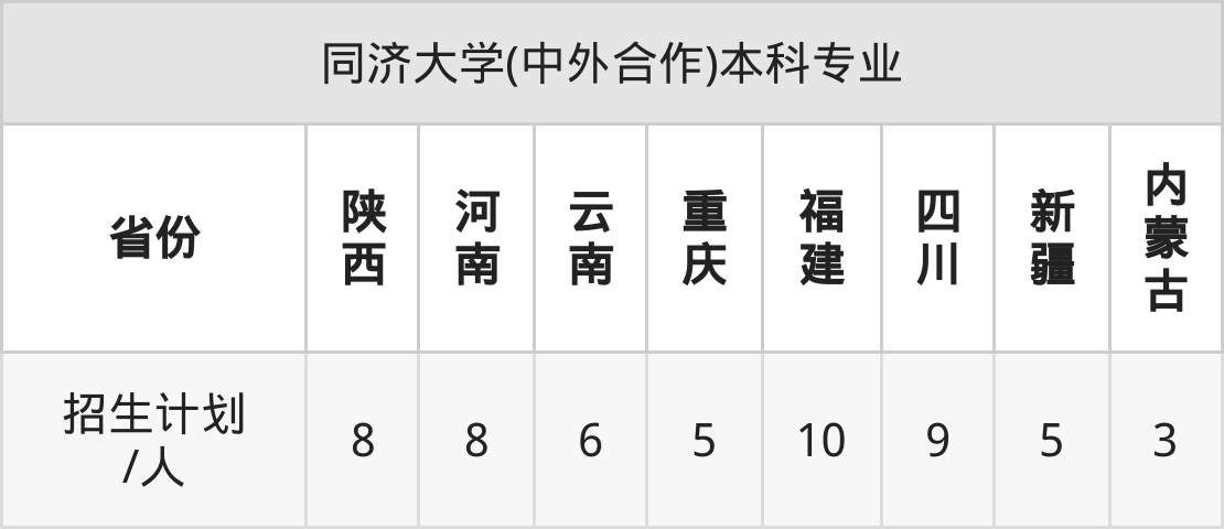 同济大学(中外合作)面向重庆(5人)、福建(10人)、四川(9人)、新疆(5人)、内蒙古(3人)、陕西(8人)、河南(8人)等8个地区开展本科招生。其中云南招生批次为一本,重庆、福建招生批次为本科批,其余省份为本科一批。