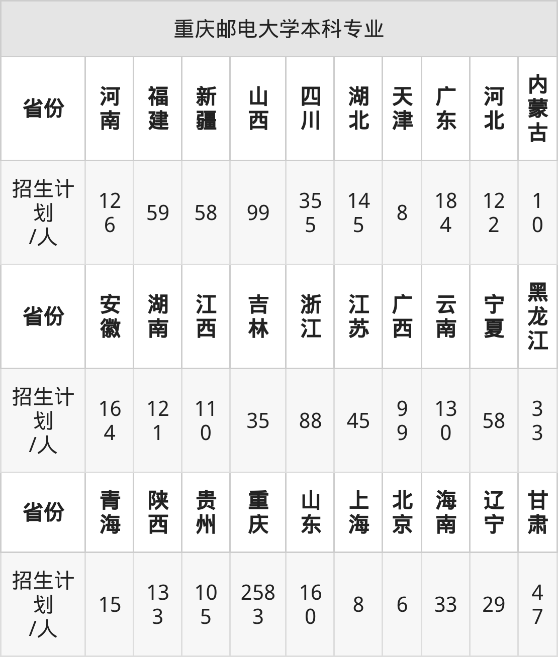重庆邮电大学面向天津(8人)、浙江(88人)、四川(355人)、宁夏(58人)、湖南(121人)、湖北(145人)、新疆(58人)等30个地区开展本科招生。其中内蒙古、河南、陕西、新疆招生批次为本科一批,其余省份为本科批。