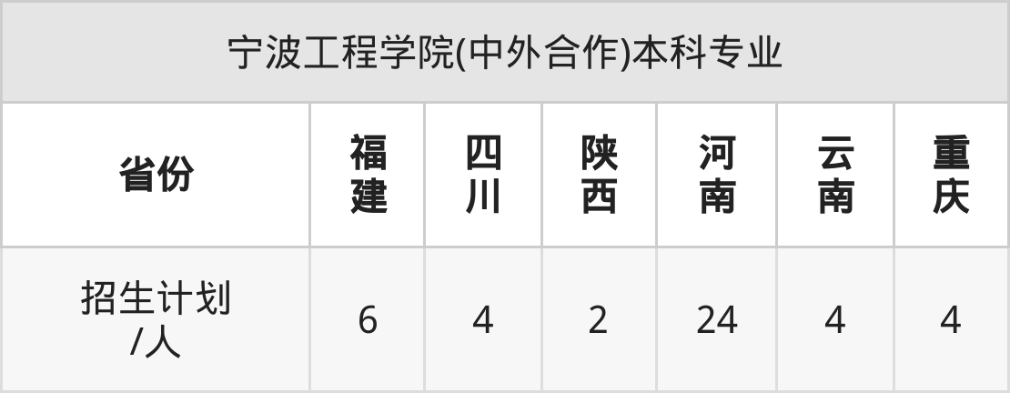 宁波工程学院(中外合作)面向云南(4人)、重庆(4人)、福建(6人)、四川(4人)、陕西(2人)、河南(24人)开展本科招生。其中云南招生批次为二本,重庆、福建招生批次为本科批,其余省份为本科二批。