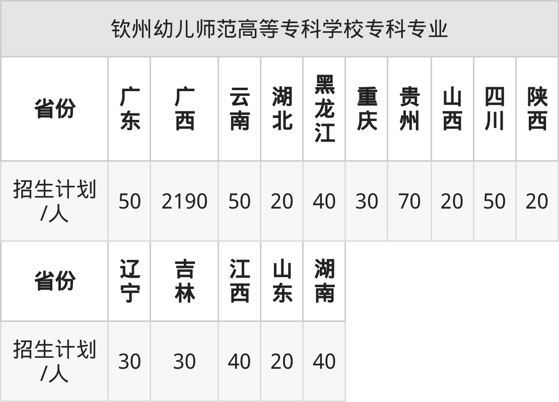 钦州幼儿师范高等专科学校面向黑龙江(40人)、江西(40人)、湖北(20人)、重庆(30人)、云南(50人)、吉林(30人)、山东(20人)等15个地区开展专科招生。其中山东招生批次为二段,其余省份为专科批。