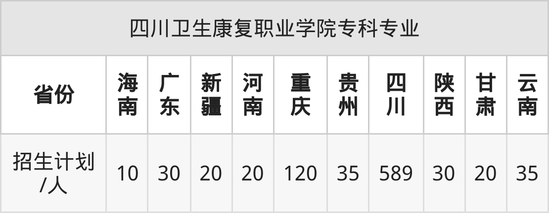 四川卫生康复职业学院面向陕西(30人)、新疆(20人)、河南(20人)、云南(35人)、海南(10人)、贵州(35人)、广东(30人)等10个地区开展专科招生。招生批次为专科批。
