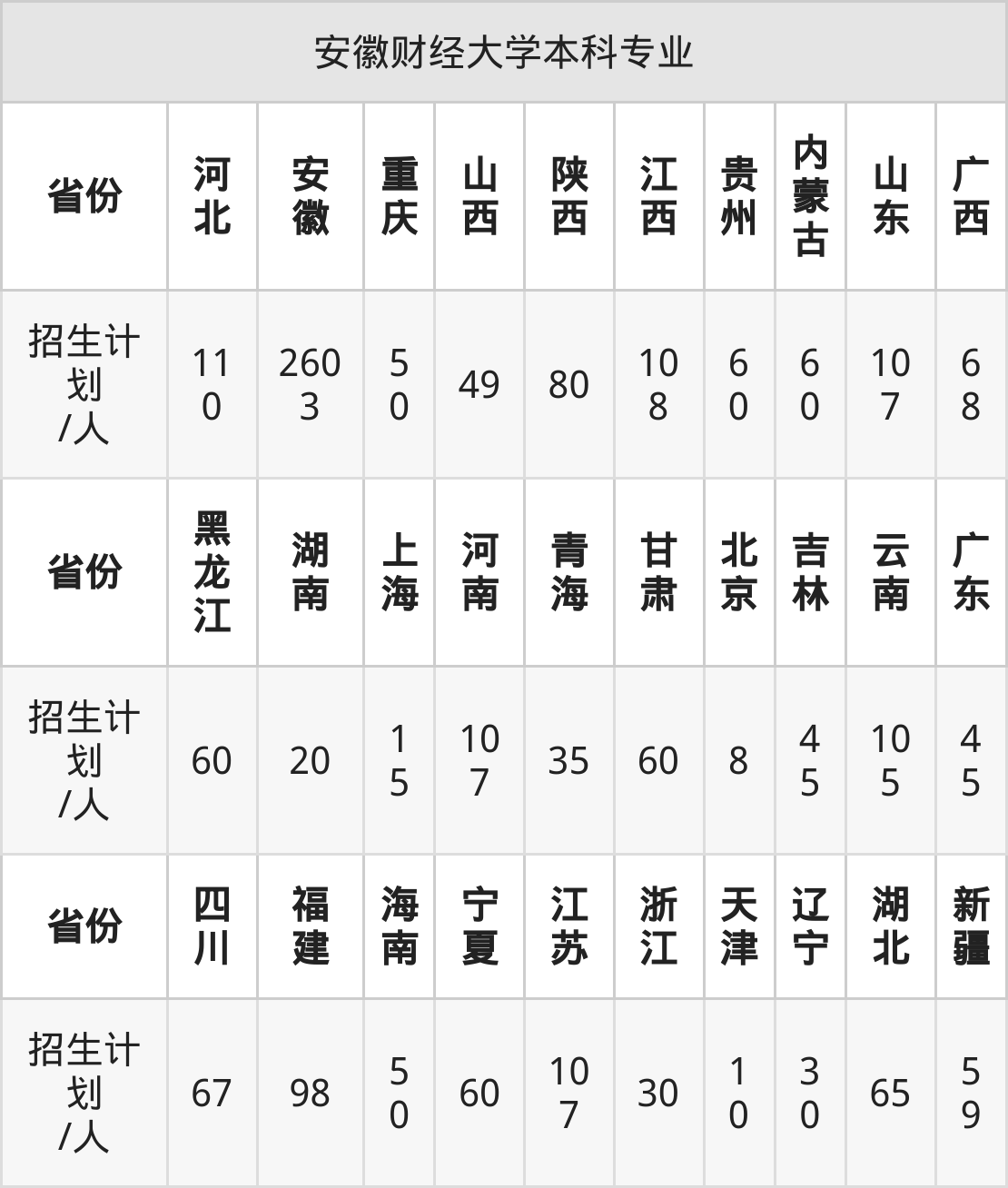 安徽财经大学面向内蒙古(60人)、江西(108人)、天津(10人)、宁夏(60人)、云南(105人)、安徽(2603人)、江苏(107人)等30个地区开展本科招生。其中山西招生批次为第一批本科B类,内蒙古、陕西、四川、河南、新疆招生批次为本科一批,其余省份为本科批。