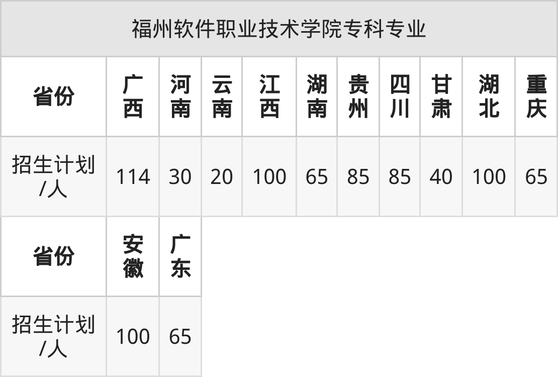 福州软件职业技术学院面向四川(85人)、江西(100人)、湖北(100人)、湖南(65人)、重庆(65人)、贵州(85人)、安徽(100人)等12个地区开展专科招生。招生批次为专科批。