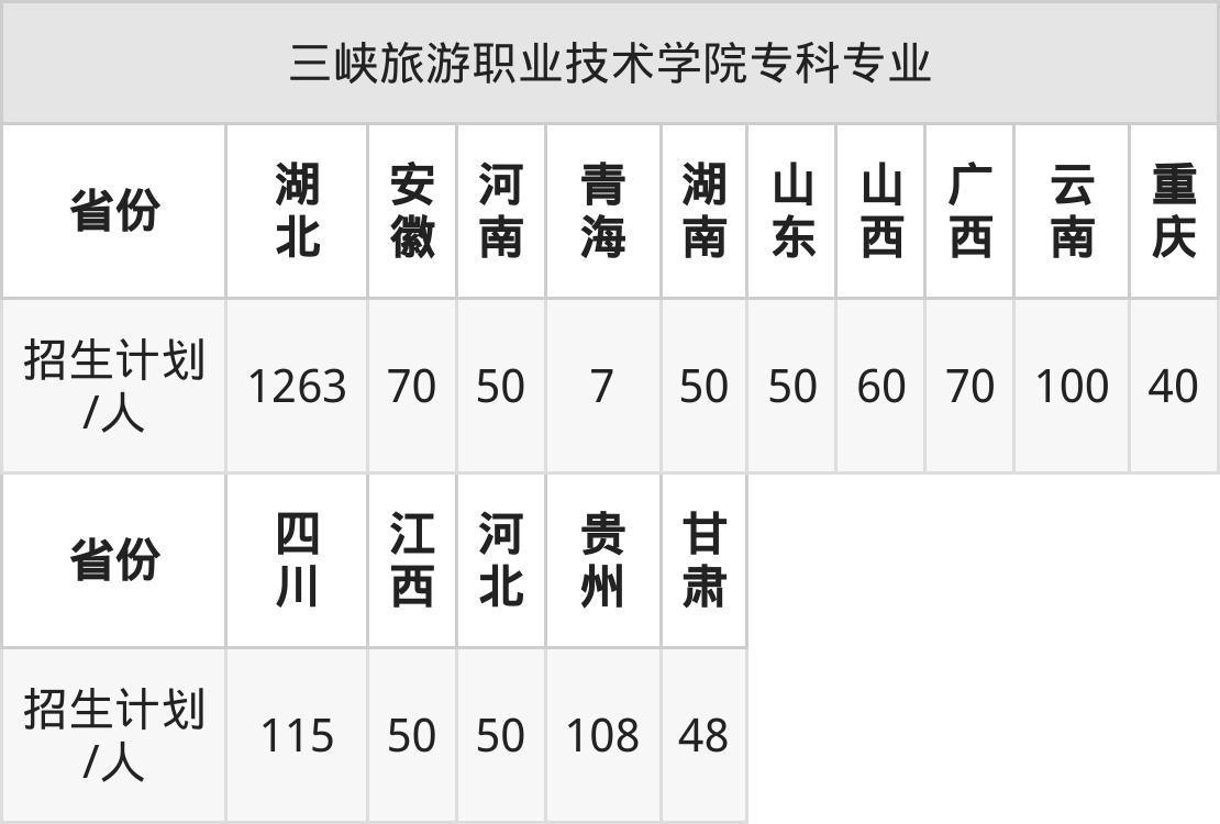 三峡旅游职业技术学院面向湖北(1263人)、甘肃(48人)、湖南(50人)、江西(50人)、山东(50人)、河北(50人)、山西(60人)等15个地区开展专科招生。其中山东招生批次为二段,其余省份为专科批。