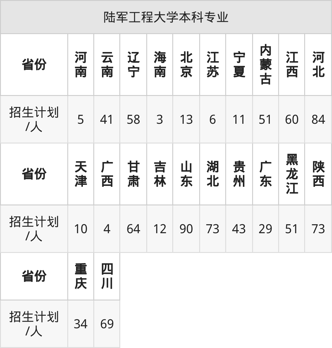 陆军工程大学面向重庆(34人)、贵州(43人)、四川(69人)、云南(41人)、辽宁(58人)、吉林(12人)、江西(60人)等22个地区开展本科招生。其中宁夏招生批次为第二批本科,江西、四川招生批次为本科提前批,陕西、内蒙古、河南招生批次为本科二批,重庆、甘肃、吉林、河北招生批次为本科提前批A,其余省份为本科批。