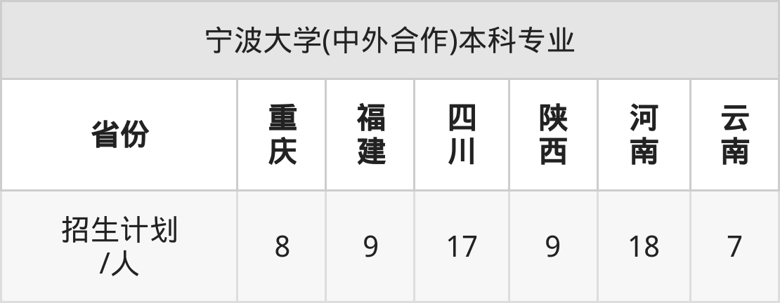 宁波大学(中外合作)面向福建(9人)、四川(17人)、陕西(9人)、河南(18人)、云南(7人)、重庆(8人)开展本科招生。其中云南招生批次为一本,福建、重庆招生批次为本科批,其余省份为本科一批。