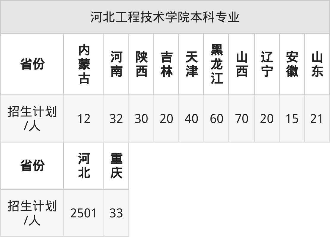 河北工程技术学院面向山西(70人)、安徽(15人)、内蒙古(12人)、河南(32人)、辽宁(20人)、重庆(33人)、河北(2501人)等12个地区开展本科招生。其中天津招生批次为本科批B段,陕西、内蒙古、河南招生批次为本科二批,其余省份为本科批。