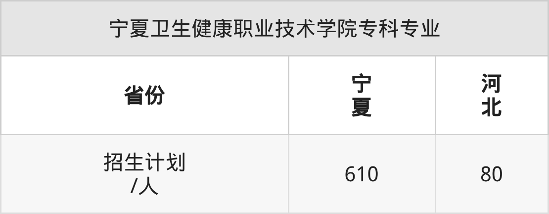 宁夏卫生健康职业技术学院面向河北(80人)、宁夏(610人)开展专科招生。招生批次为专科批。
