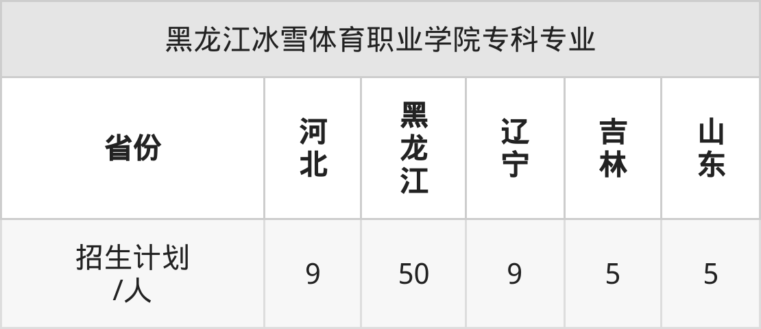 黑龙江冰雪体育职业学院面向辽宁(9人)、吉林(5人)、山东(5人)、河北(9人)、黑龙江(50人)开展专科招生。其中山东招生批次为二段,其余省份为专科批。