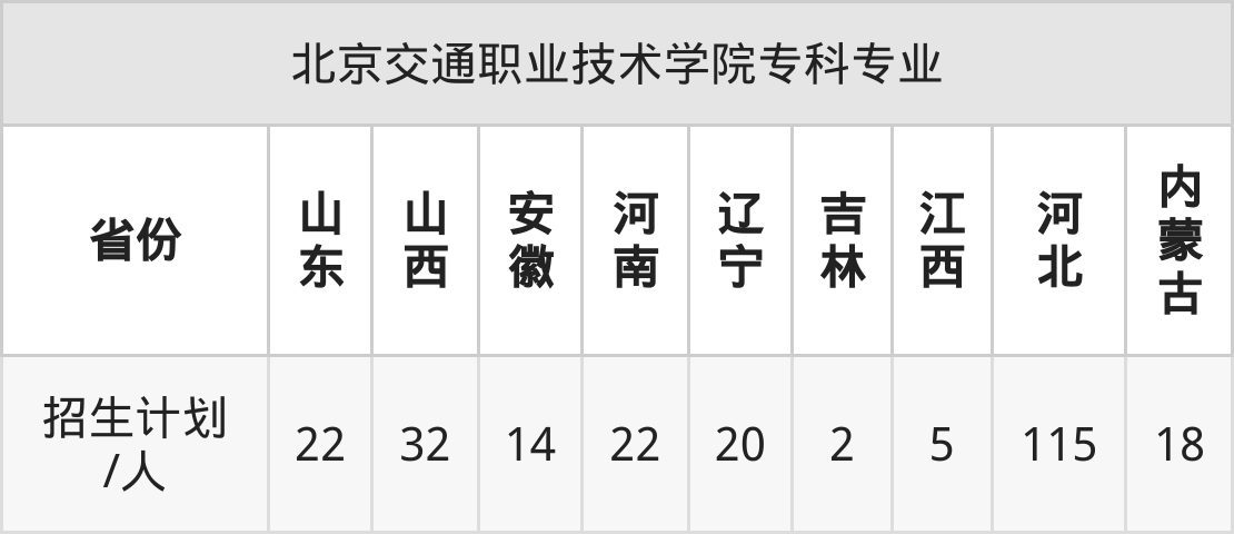 北京交通职业技术学院面向江西(5人)、山东(22人)、河北(115人)、山西(32人)、吉林(2人)、内蒙古(18人)、河南(22人)等9个地区开展专科招生。其中山东招生批次为二段,其余省份为专科批。