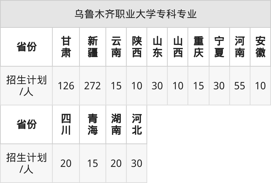 乌鲁木齐职业大学面向重庆(15人)、安徽(10人)、陕西(10人)、湖南(20人)、云南(15人)、山东(30人)、山西(10人)等14个地区开展专科招生。其中山东招生批次为二段,其余省份为专科批。